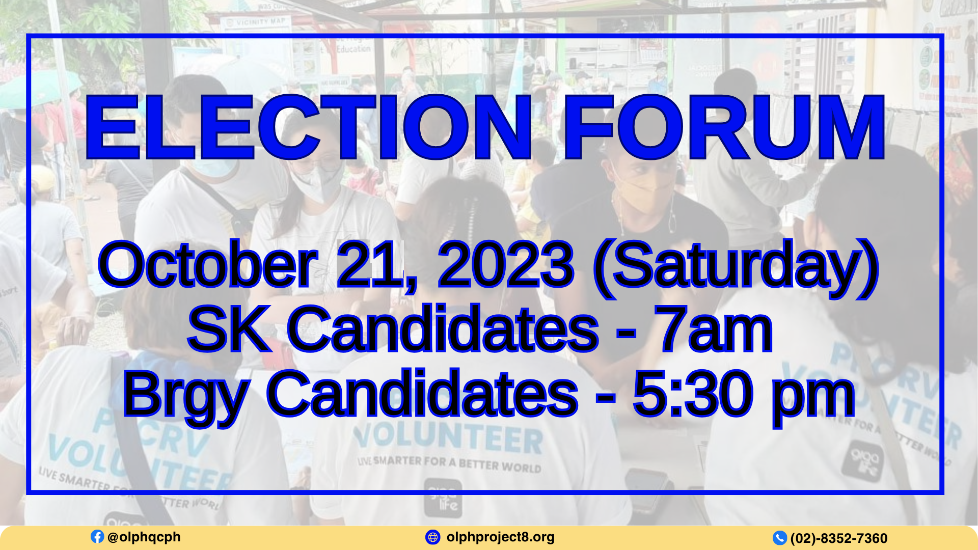 Update:As advised by the COMELEC to avoid any technicalities the upcoming event shall be rescheduled within the campaign period. The new schedule will be on October 21, 2023 (Saturday), same time and place. October 14, 2023 (Saturday)All registered voters are invited to attend and listen to our