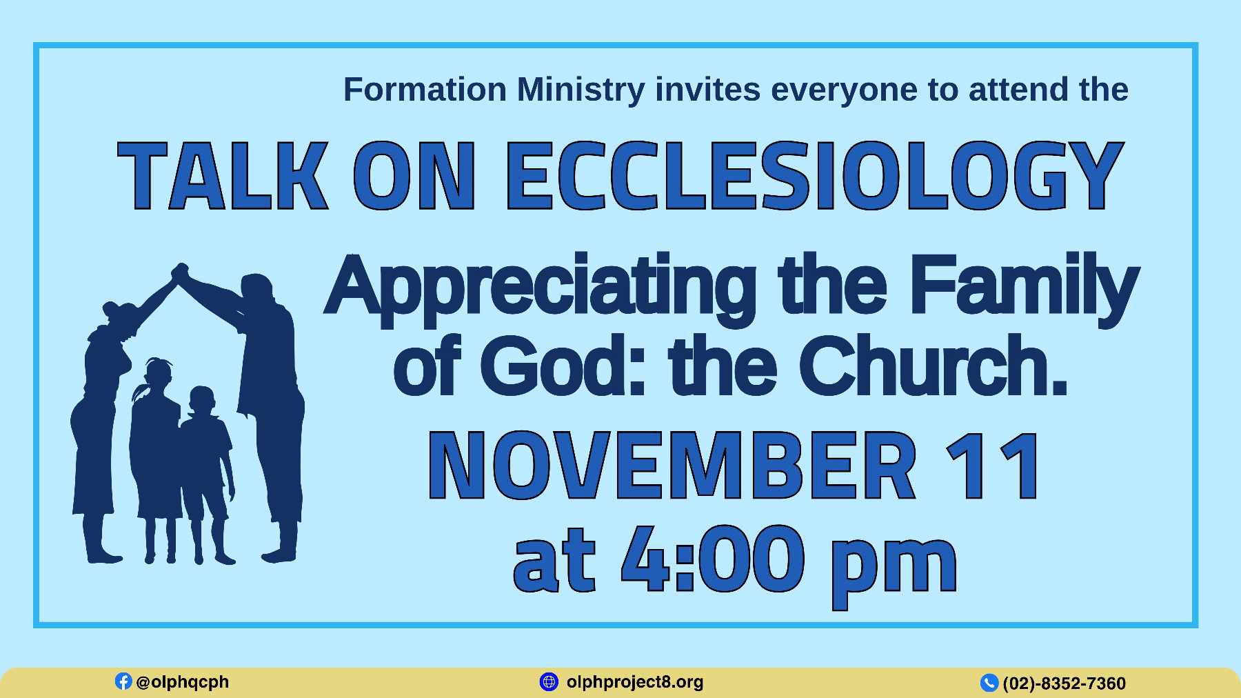 Formation Ministry invites everyone to attend the TALK ON ECCLESIOLOGY Appreciating the Family of God: the ChurchNOVEMBER 11 at 4:00 PM.