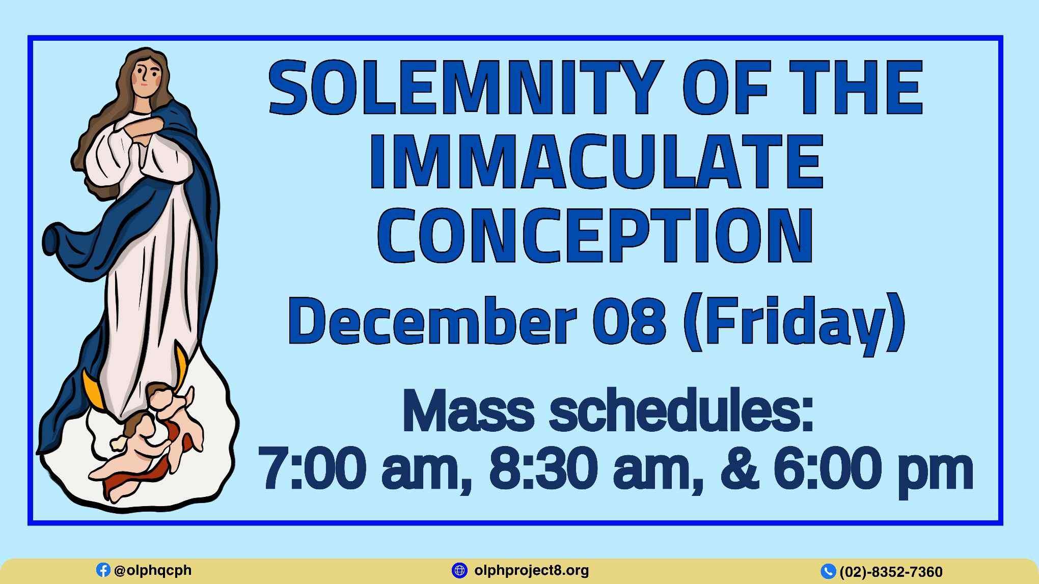 December 8, Friday is the Solemnity of the Immaculate Conception, a holy day of obligation. Our masses are 7:00 and 8:30 in the morning and 6:00 in the evening.