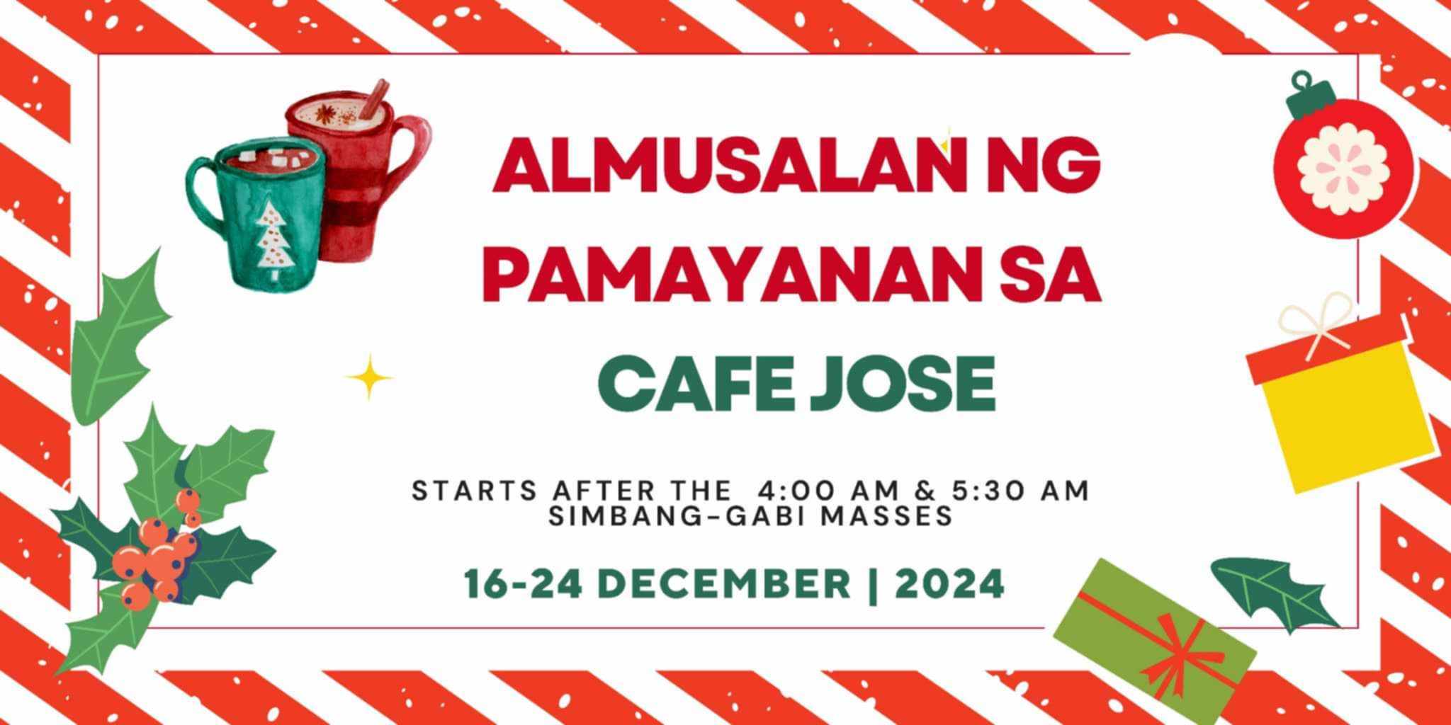 Almusalan ng Pamayanan sa Cafe Jose16-24 December 2024Starts after the 4:00AM and 5:30 AM Simbang Gabi Masses