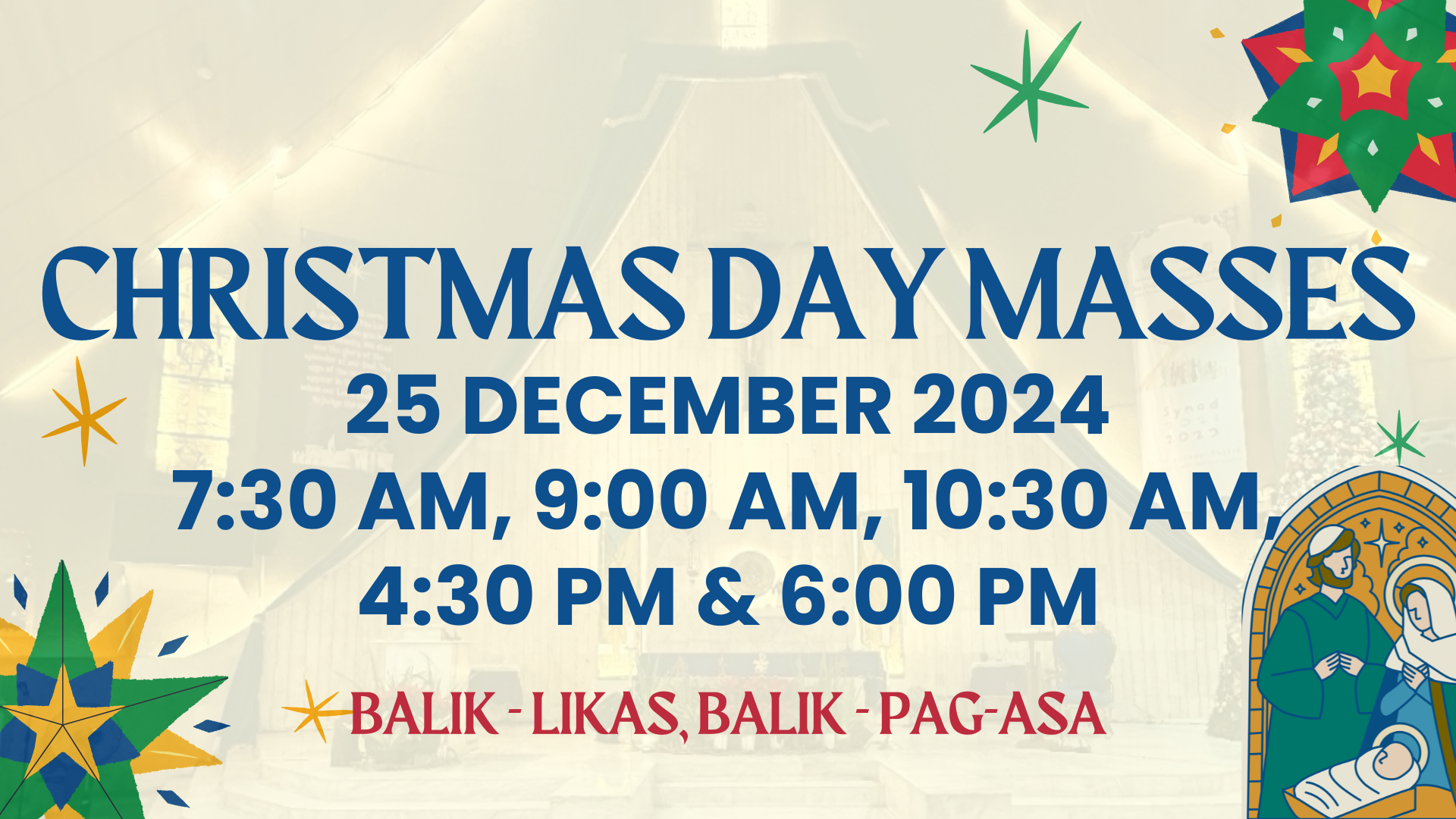 25 December 20247:30 AM; 9:00 AM; 10:30 AM; 4:30 PM; 6:00 PM