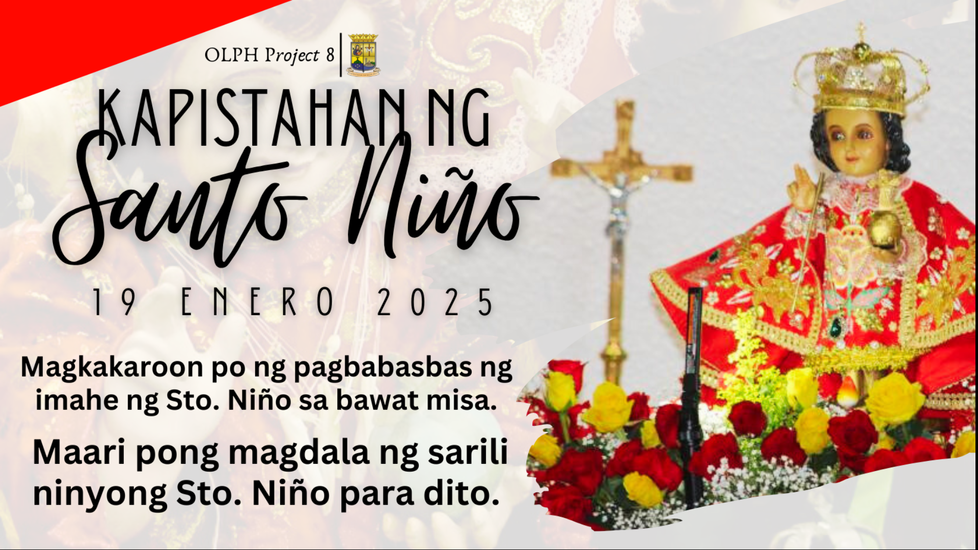 19 Enero 2025 Magkakaroon po ng pagbabasbas ng imahe ng Sto. Niño sa bawat misa. Maari pong magdala ng sarili ninyong Sto. Niño para dito. Feast of Santo Niño 19 January 2025 There will be a blessing of the image of the Holy Child (Sto. Niño) at every Mass. You may bring your own Sto.…