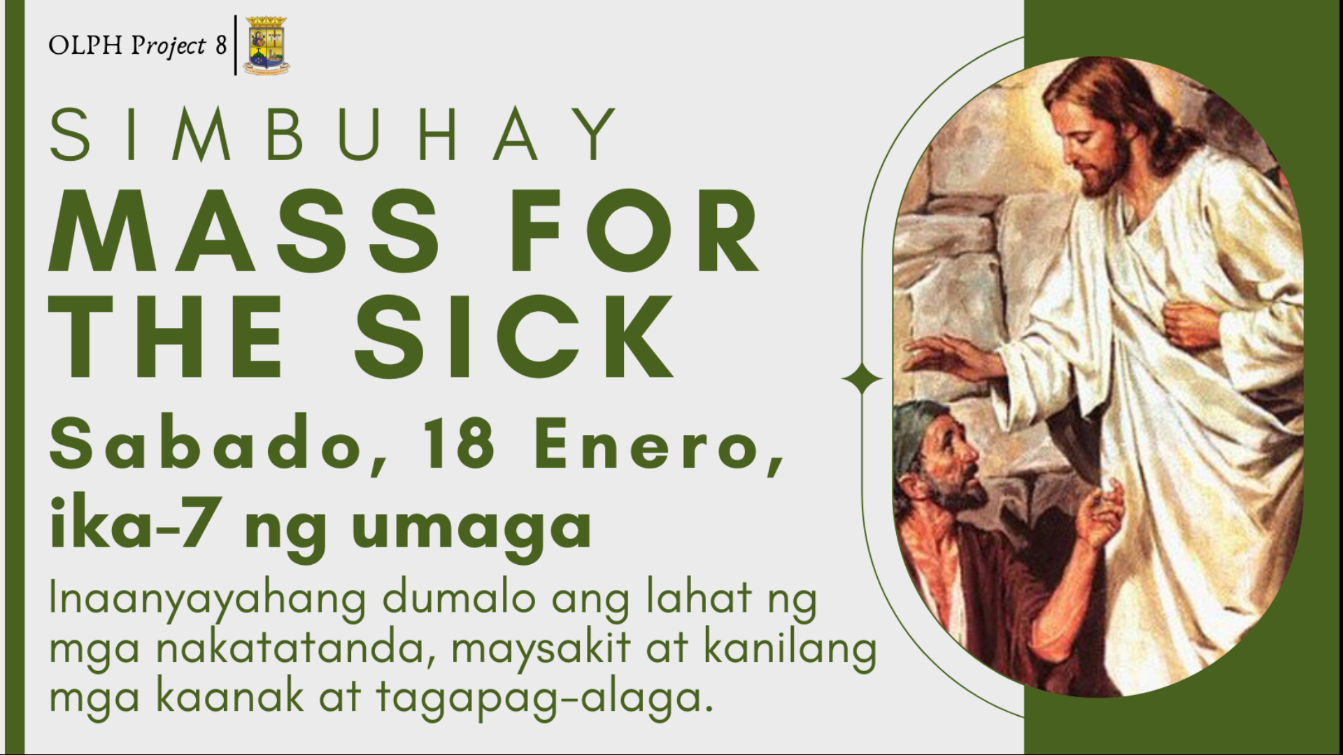 Sabado, 18 Enero 2025, ika-7:00 ng umaga Inaanyayahang dumalo ang lahat ng mga nakatatanda, maysakit at kanilang mga kaanak at tagapag-alaga. Saturday, 18 January 2025, 7:00 AM Everyone, including the elderly, the sick, their relatives, and caregivers, are invited to attend.