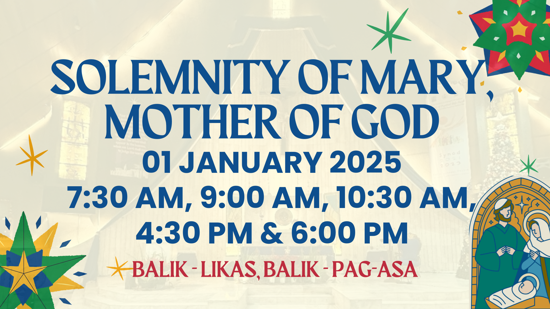 Schedule of Masses:1 January 20257:30 AM; 9:00 AM; 10:30 AM; 4:30 PM; 6:00 PM