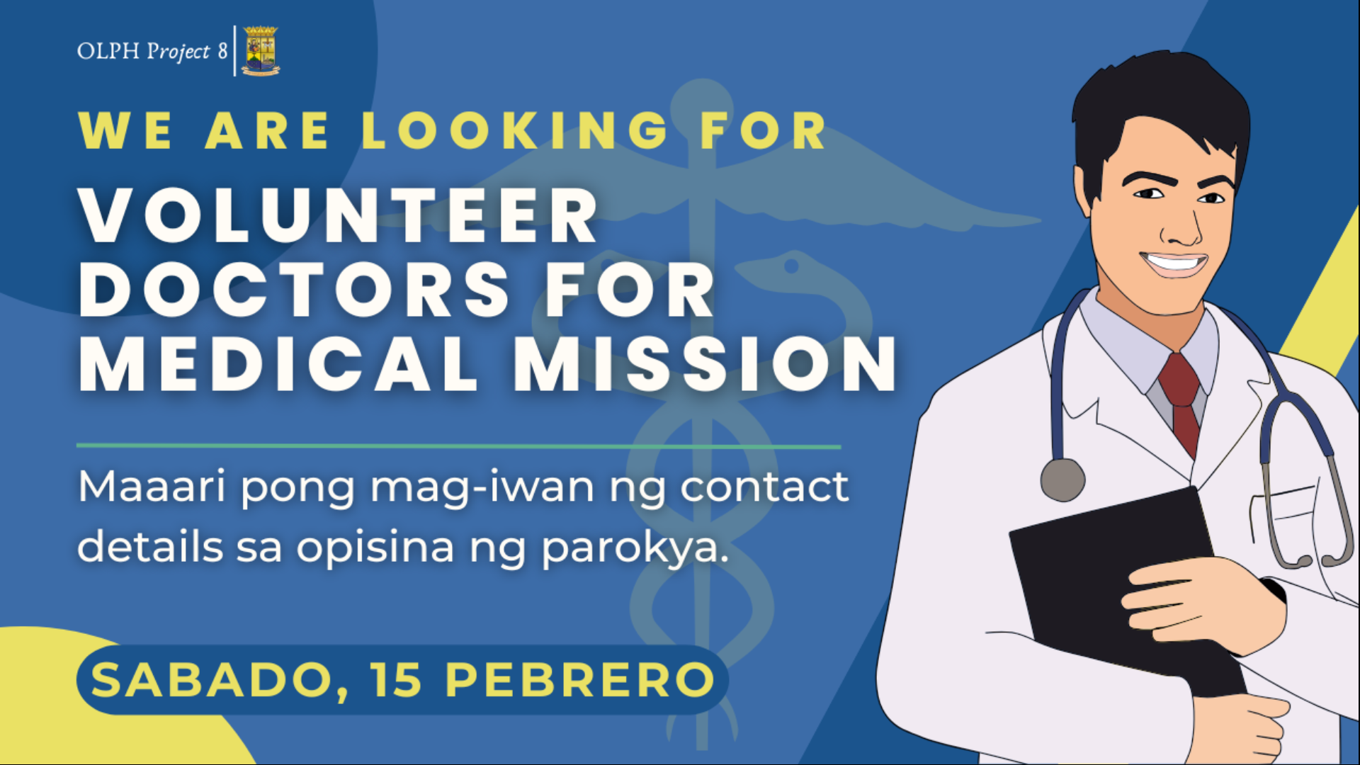 Naghahanap kami ng mga boluntaryong doktor para sa medical mission sa 15 Pebrero, 2025 Sabado. Maaari pong mag-iwan ng contact details sa opisina ng parokya. We are looking for volunteer doctors for medical mission on 15 February, 2025 Saturday. You may leave your contact details at the parish office.